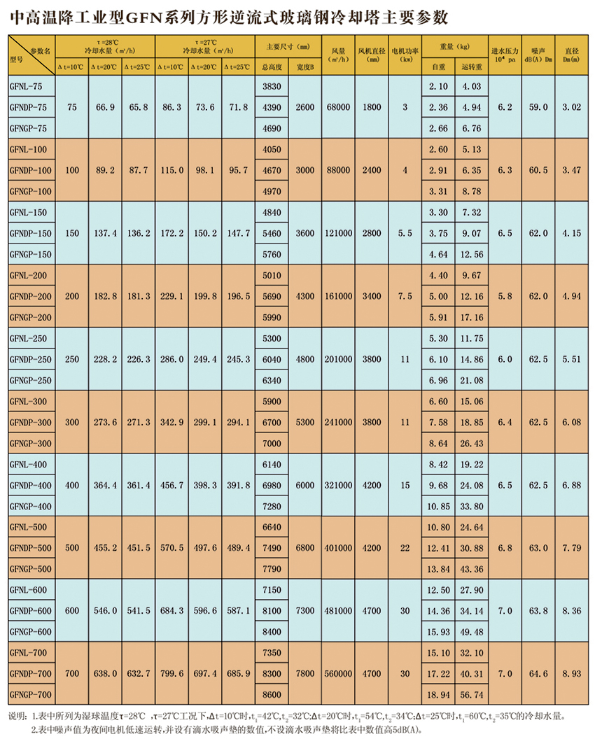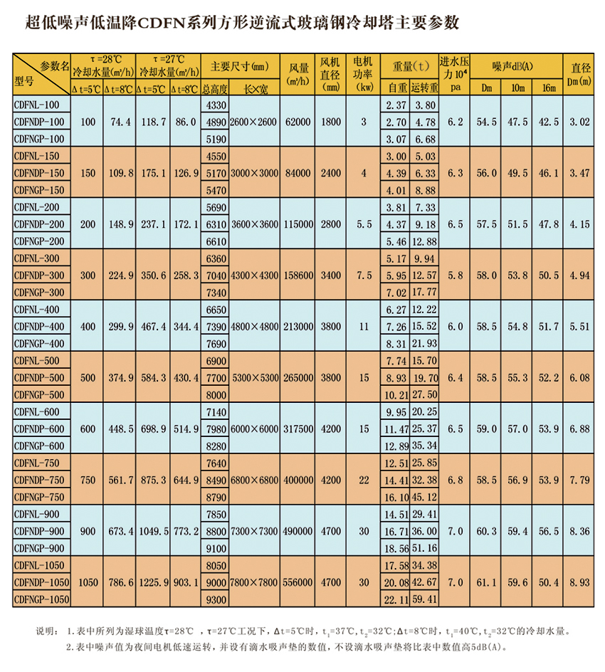 工業(yè)型玻璃鋼冷卻塔,室友機(jī)械工業(yè)部第四設(shè)計(jì)研究院在原設(shè)計(jì)的同類塔測(cè)試數(shù)據(jù)基礎(chǔ)上改進(jìn)設(shè)計(jì)的。本設(shè)計(jì)的特點(diǎn)是冷卻塔風(fēng)機(jī)配有變扭矩雙速電機(jī);當(dāng)氣溫較低時(shí),例如晚上,電機(jī)開低速,冷卻噪聲可低3-5dB(A)。此外,選用雙速電機(jī)節(jié)電顯著。多臺(tái)冷卻塔配單速電機(jī)時(shí),為了節(jié)電,當(dāng)空氣濕球溫度低時(shí),可停部分電機(jī),但仍比用雙速電機(jī)(以年計(jì))多耗電40%。